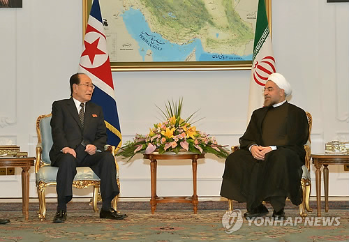 | △ 北 김영남, 이란 로하니 대통령 만나 (서울=연합뉴스) 북한 김영남 최고인민회의 상임위원장(왼쪽)이 3일 이란에서 하산 로하니 신임 대통령을 만났다고 조선중앙통신이 4일 보도했다. 2013.8.4 photo@yna.co.kr |