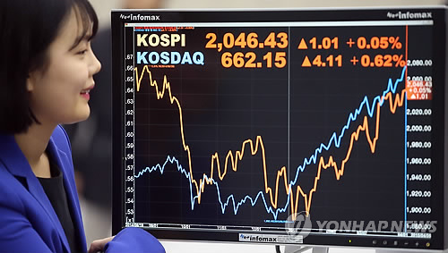 | △ 코스피, 2,040선에 안착…코스닥은 660선 돌파 (서울=연합뉴스) 박동주 기자 = 6일 코스피는 전날보다 1.01포인트(0.05%) 오른 2,046.43으로 장을 마감하며 연중 고점을 갈아치웠다. 이는 지난해 9월 19일(2,053.82) 이후 6개월여 만의 최고치다. |