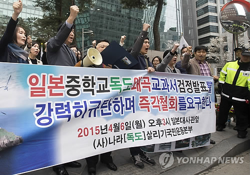 | △ '독도 왜곡 교과서 검정발표 규탄한다' (서울=연합뉴스) 윤동진 기자 = 6일 오후 서울 종로구 일본대사관 앞에서 열린 기자회견에서 독도살리기 국민운동본부 회원들이 일본 중학교의 독도왜곡교과서 검정발표를 규탄하는 구호를 외치고 있다. |