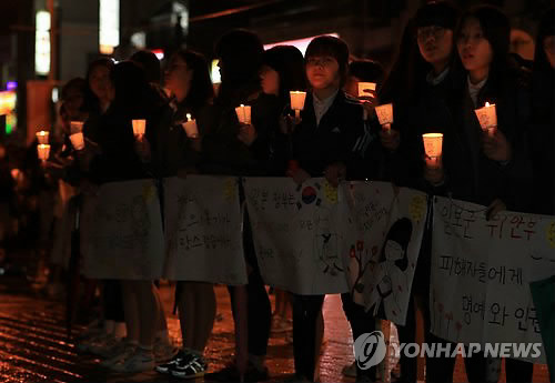 (통영=연합뉴스) 일본군 위안부 문제에 대한 일본 정부의 책임 이행을 촉구하는 학생과 시민이 6일 오후 경남 통영시 강구안 문화마당에서 작은 현수막과 촛불을 들고 있다.