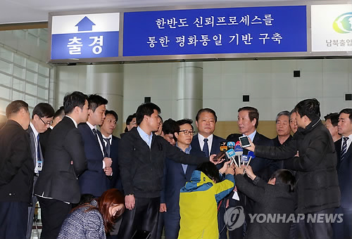 | △ 답변하는 정기섭 개성공단기협회장 (파주=연합뉴스) 임병식 기자 = 정기섭 개성공단기업협회 회장이 7일 오전 경기도 파주시 경의선 남북출입사무소에서 출경을 앞두고 취재진 질문에 답하고 있다. 이날 개성공단기협 회장단은 개성공단에서 '임금인상' 관련해 기업책임자회의 운영위원회를 연 뒤 북한 중앙특구개발지도총국을 항의 방문할 예정이다. |