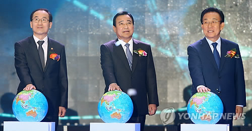| △ 물포럼 성공기원 퍼포먼스 (경주=연합뉴스) 김준범 기자 = 20일 오후 경북 경주화백컨벤션센터(HICO)에서 열린 '2015년 세계 물의 날 정부기념식'에 참여한 이완구 국무총리(가운데), 윤성규 환경부 장관(왼쪽), 김관용 경북도지사(오른쪽)가 기념 퍼포먼스를 하고 있다. 2천여명이 참석한 이번 기념식은 다음 달 12∼17일 대구·경북에서 열리는 제7차 세계 물포럼의 분위기 조성과 성공을 다짐하는 취지에서 진행됐다. 2015.3.20 psykims@yna.co.kr |