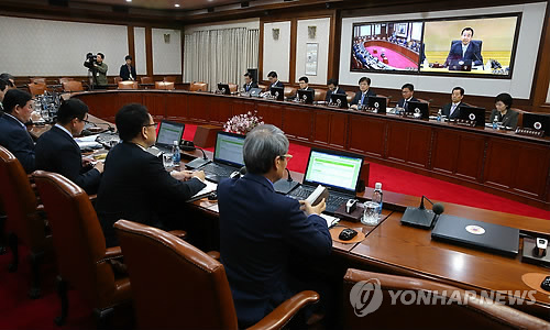 | △ 이완구 국무총리 발언듣는 국무위원들 (서울=연합뉴스) 황광모 기자 = 7일 오전 서울 세종로 정부서울청사에서 열린 국무회의에서 참석한 각 부처 장·차관들이 이완구 국무총리의 모두 발언을 듣고 있다. 이날 국무회의는 서울과 세종간 영상회의로 진행됐다. |