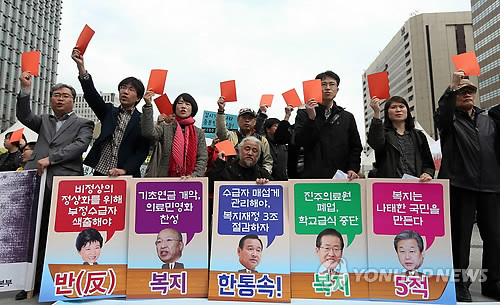 (서울=연합뉴스) 설승은 기자 = 정부가 복지재정 효율화 방안을 통해 연 3조원의 예산을 절감하겠다고 밝힌 것과 관련 시민단체들이 해당 정책 폐기와 복지재정 확대를 촉구했다.