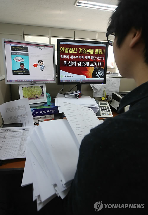 | △ 납세자연맹 "연말정산 보완책 합리성, 공평성 결여' (서울=연합뉴스) 김주성 기자 = 정부가 연말정산 보완대책을 발표한 7일 서울 종로구 신문로 한국납세자연맹에서 직원들이 이번 보완책과 관련한 납세자 권리 찾기 활동 계획을 논의하고 있다. 한국납세자연맹은 이번 보완대책과 관련, "근로소득 과세에 대한 기본 철학이나 원칙도 없이 합리성과 공평성이 결여된 세법개정과 세수 추계로 소득세법을 누더기로 만들어 놨다"고 비판했다. |
