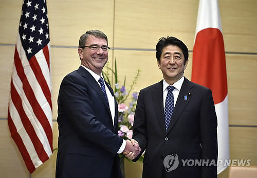 아베 신조(安倍晋三) 총리는 이날 오후 카터 장관과 만난 자리에서 집단 자위권 행사를 가능하게 하는 안보법제 정비에 의욕을 보이고 오키나와(沖繩)현 상당수 주민이 반대하는 후텐마(普天間) 미군 기지의 현내 이전을 "확고한 결의 아래 추진할 것"이라고 말했다.