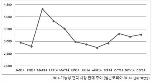 9일 시장조사기관 닐슨코리아에 따르면 지난해 3~4월 기능성 캔디의 판매량이 연평균 대비 25%가량 많은 것으로 나타났다.