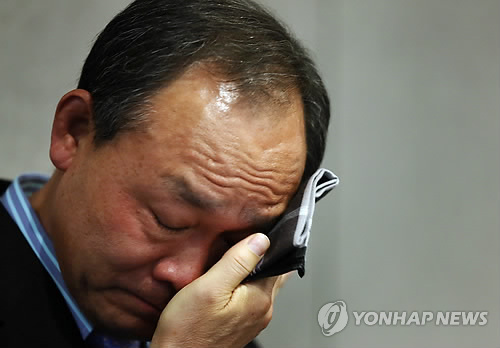 | △ 성완종 전 회장 '나는 MB맨이 아닙니다' (서울=연합뉴스) 이지은 기자 = 자원외교 비리에 연루됐다는 의혹을 받고 있는 성완종 전 경남기업 회장이 8일 오후 서울 중구 은행회관에서 기자회견을 하던 중 눈물을 닦고 있다. |