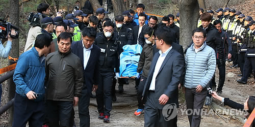 | △ 숨진 채 발견된 성완종 전 회장 (서울=연합뉴스) 한종찬 기자 = 9일 오후 북한산 형제봉 매표소 인근에서 숨진 채 발견된 성완종 전 경남기업 회장의 시신을 경찰 관계자들이 옮기고 있다. 성 전 회장은 자원외교 비리 의혹에 연루돼 사전 구속영장이 청구된 상태였다. |