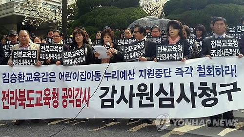 | △ 전북어린이집연합회, 감사원서 누리예산 지원 촉구 (전주=연합뉴스) 전북어린이집연합회 대표들은 9일 오전 감사원 앞에서 도교육청의 어린이집 누리과정 예산지원을 촉구하는 집회를 하고 했다. 2015.4.9 <<전북어린이집연합회 제공>> kan@yna.co.kr |
