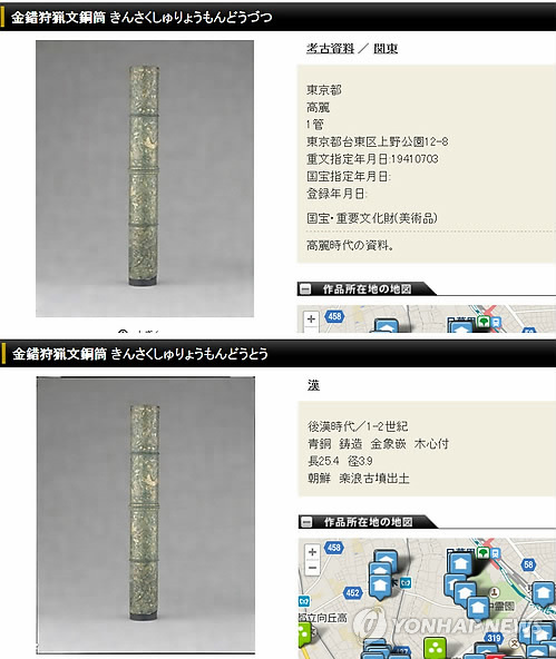 | △ 韓문화재 고려·후한 유물로 중복 게재한 日문화청 홈피 (도쿄=연합뉴스) 조준형 특파원 = 일본 문화청 홈페이지의 한국 문화재 출처 및 시기 표기에 오류가 있는 것으로 확인됐다. 9일 문화청 홈페이지를 확인한 결과, '금착수렵문동통(金錯狩獵文銅筒)'이라는 문화재가 한반도 항목과 중국 항목에 중복 등장하는 것으로 나타났다. 한반도 항목에는 고려 유물로 분류돼 있으며, 1941년 7월 3일 일본의 '중요 문화재'로 지정된 사실이 기재됐다. 동시에 이 문화재는 '1∼2세기 후한(後漢) 시대'라는 표기와 함께, 중국 항목에도 포함됐다. '낙랑고분'에서 출토됐다는 설명도 붙었다. 2015.4.9 jhcho@yna.co.kr |