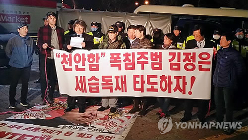 | △ 탈북단체 대북전단 살포 시도…경찰 원천봉쇄 (파주=연합뉴스) 탈북자 단체인 자유북한운동연합과 미국 인권단체 등이 9일 오후 경기도 파주시 문산읍 자유로휴게소에서 대북전단 살포시도에 앞서 북한의 세습체제를 비판하는 내용의 성명서를 읽고 있다. 경찰은 이들의 대북전단 살포를 막을 방침이다. 2015.4.9 suki@yna.co.kr |