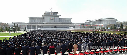 | △ 지난 2013년 4월 30일 금수산태양궁전 광장에서 김정일 국방위원회 제1위원장이 궁전 조성에 기여한 간부와 근로자들에게 보낸 감사문의 전달식을 하는 모습. <<연합뉴스DB>> |