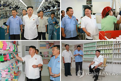 | △ 北 김정은, 평양양말공장 방문 (서울=연합뉴스) 북한 김정은 국방위원회 제1위원장이 평양양말공장을 현지지도했다고 노동당 기관지 노동신문이 7일 전했다. 2014.8.7 << 북한부기사참조 >> nkphoto@yna.co.kr |