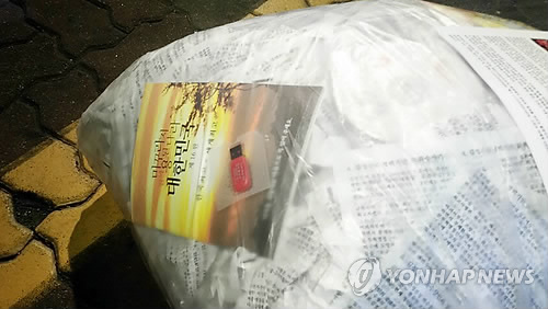| △ 날리지 못한 대북전단 (파주=연합뉴스) 탈북자 단체인 자유북한운동연합과 미국인권재단 등이 9일 경기도 파주에서 대북전단을 살포하려 했으나 경찰이 막은데 바람 방향도 맞지 않아 무산됐다. suki@yna.co.kr |