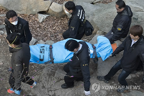 | △ 실려나오는 성완종 전 회장 시신 (서울=연합뉴스) 윤동진 기자 = 9일 오후 북한산 형제봉 매표소 인근에서 숨진 채 발견된 성완종 전 경남기업 회장의 시신을 경찰 관계자들이 옮기고 있다. |
