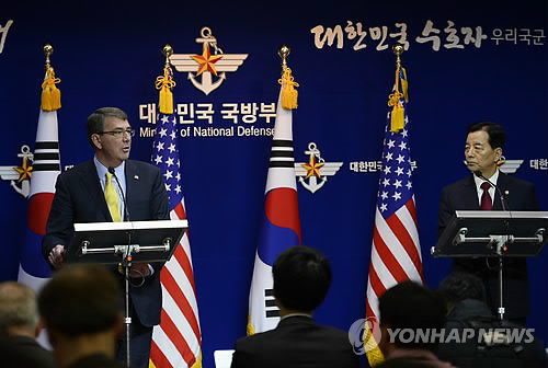 (서울=연합뉴스) 김귀근 이영재 기자 = 한민구 국방부 장관과 애슈턴 카터 미국 국방부 장관은 10일 서울에서 한미 국방장관회담을 한 뒤 가진 공동기자회견에서 미국의 고고도미사일방어체계인 '사드'(THAAD) 배치 문제는 의제로 논의되지 않았다고 밝혔다.