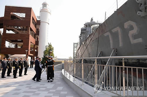 그는 천안함 선체 앞에서 "이것은 평화와 안정이 거저 주어지는 것이 아니라 수호돼야 할 그 무엇이라는 것을 상기시켜주는 존재"라고 강조했다.