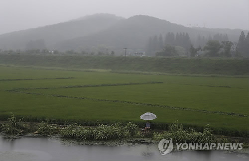 | △ A farmer sits at a rice field on a rainy morning, Wednesday, July 30, 2014 in Pyongyang, North Korea. As the planting season ends and the rainy season begins, North Koreans are girding for the possibility of floods, which, after weeks of drought, have already caused some damage across wide swaths of the nation. (AP Photo/Wong Maye-E) |