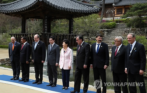 | △ 제7차 세계 물포럼 환영오찬서 기념촬영 (대구=연합뉴스) 도광환 기자 = 박근혜 대통령이 12일 오후 대구 계명대학교에서 열린 제7차 셰계물포럼 환영오찬에서 오찬을 마친 뒤 주요 참석자들과 기념촬영하고 있다.왼쪽부터 호세 앙겔 구리아 OECD 사무총장, 물라투 테시호메 위르쿠 에티오피아 대통령, 알베르 2세 모나코 대공, 구르반굴리 베르디무하메도프 투르크메니스탄 대통령, 박 대통령, 에모말리 라흐몬 타지키스탄 대통령, 야노슈 아데르 헝가리 대통령, 압데리라 벤키란 모로코 총리, 얀 엘리아슨 유엔 사무부총장. 2015.4.12 dohh@yna.co.kr |