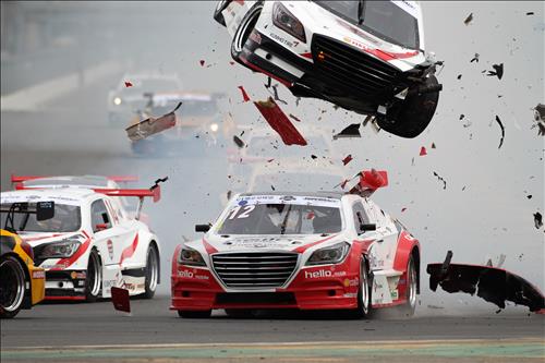 (서울=연합뉴스) 정아란 기자 = 레이서로 활동 중인 가수 김진표(38)가 12일 국내 자동차 경주대회인 CJ 헬로모바일 슈퍼레이스에서 차량이 대파되는 사고를 당했다.