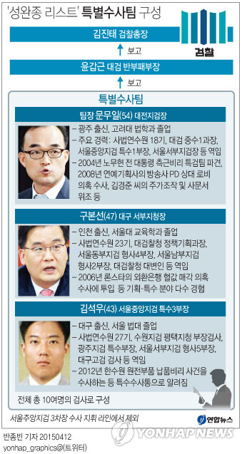 | △ <그래픽> '성완종 리스트' 특별수사팀 구성 (서울=연합뉴스) 반종빈 기자 = 대검찰청은 12일 오후 김진태 검찰총장 주재로 간부회의를 열어 '성완종 리스트' 의혹과 관련해 문무일(54·사법연수원 18기) 대전지검장을 팀장으로 하는 특별수사팀을 구성, 본격 수사에 착수했다. bjbin@yna.co.kr |