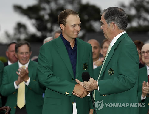 | △ 그린 재킷의 조던 스피스 (오거스타 AP=연합뉴스) 만 21세의 신예 조던 스피스(미국·왼쪽)가 12일(현지시간) 미국 조지아주 오거스타 내셔널 골프장에서 제79회 마스터스 골프 토너먼트 정상에 오른 후 우승자에게 주어지는 '그린 재킷'을 입고 빌리 페인 오거스타 내셔널 회장과 악수를 나누고 있다. |