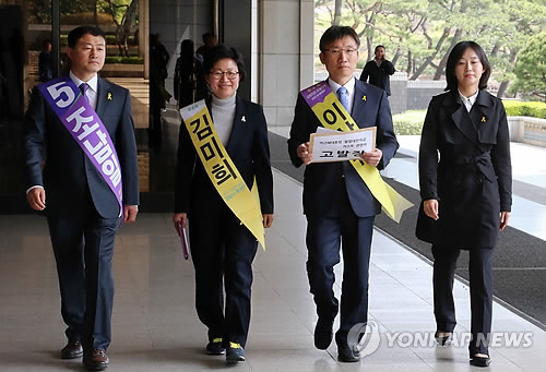 | △ 고발장 접수하는 옛 통합진보당 관계자들 (서울=연합뉴스) 최재구 기자 = 이상규 전 의원을 비롯한 옛 통합진보당 관계자들이 '성완종 리스트'에 오른 인물 중 일부를 검찰에 고발하기위해 13일 서초구 서울중앙지검으로 들어서고 있다. 김재연(오른쪽부터), 이상규, 김미희 전 의원과 조남일 전 민주노총 광주전남본부장은 허태열 전 대통령 비서실장과 홍준표 경남지사, 새누리당 홍문종 의원에 대한 고발장을 서울중앙지검에 제출했다. 2015.4.13 jjaeck9@yna.co.kr |