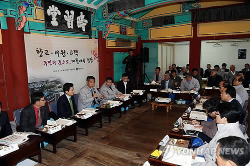 | △ 정종섭 장관, 역사문화 공동체 활성화 대책 간담회 (서울=연합뉴스) 정종섭 행정자치부 장관이 13일 오전 경북 경주 서악서원에서 '향교·서원·고택, 주민의 품으로'라는 주제로 문화유산 전문가, 전통한옥 운영자, 문화유산답사 동아리 대학생 등과 역사문화 공동체 활성화 대책 간담회를 하고 있다. (행정자치부 제공) |