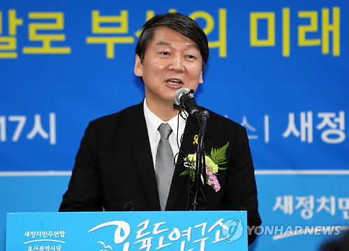 | △ (부산=연합뉴스) 조정호 기자 = 안철수 새정치민주연합 의원이 13일 오후 부산시당에서 열린 오륙도 연구소 개소식에 참석해 축사를 하고 있다. 2015.4.13 ccho@yna.co.kr |