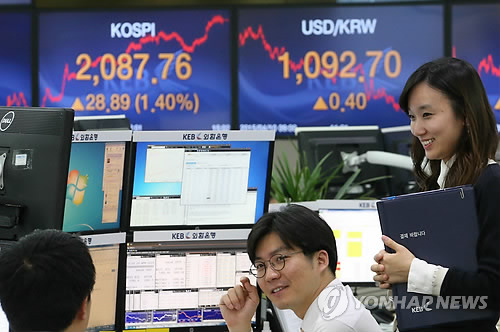 | △ 코스피, 2,090선 육박 (서울=연합뉴스) 서명곤 기자 = 코스피지수가 전날보다 28.89포인트(1.40%) 오른 2,087.76으로 거래를 마감한 10일 오후 서울 중구 명동 외환은행 본점 딜링룸에서 딜러들이 활짝 웃으며 대화를 나누고 있다. 이날 지수는 종가 기준으로 2011년 8월 2일(2,121.27) 이후 가장 높은 수준이다. 코스닥지수는 전날보다 5.06포인트(0.75%) 오른 682.02로 마감했다. 지수가 680선을 넘어선 것은 2008년 1월 14일 이후 처음이다. 2015.4.10 seephoto@yna.co.kr |