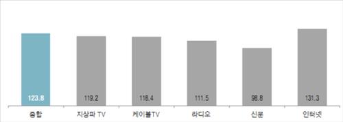 매체별 KAI는 지상파TV 119.2, 케이블TV 118.4, 라디오 111.5, 신문 98.8, 인터넷 131.3으로, 신문을 제외한 조사대상 매체 모두가 100을 넘었다.