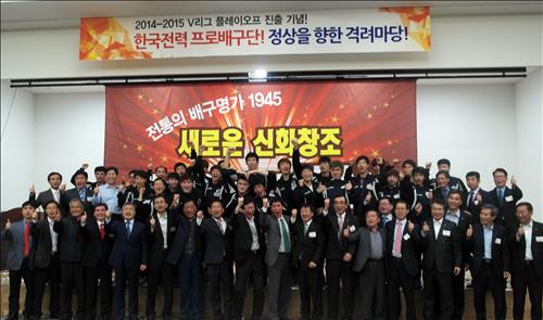 (서울=연합뉴스) 배진남 기자 = 2014-2015시즌 프로배구 정규리그에서 창단 후 최고 성적인 3위를 차지하고 플레이오프에 진출한 한국전력 선수단이 본사 임직원들로부터 격려를 받았다.