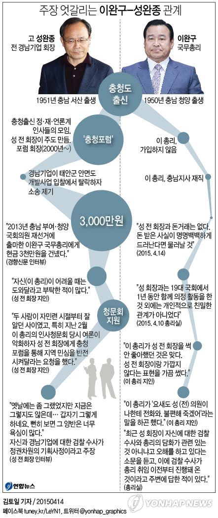 (서울=연합뉴스) 김계연 기자 = 성완종(64) 전 경남기업 회장이 이완구 국무총리에게 불법 정치자금을 건넸다는 정황이 구체적으로 14일 공개됐다. 검찰 수사의 단서가 흐릿하게나마 하나씩 잡혀가고 있다.