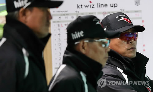 | △ 케이티 조범현 감독 '연승 후 대패' (수원=연합뉴스) 신영근 기자 = 14일 경기도 수원케이티위즈파크에서 열린 프로야구 케이티와 두산의 경기에서 2대18로 대패한 케이티 조범현 감독(오른쪽)이 착잡한 표정으로 경기를 지켜보고 있다. 2015.4.14 drops@yna.co.kr |