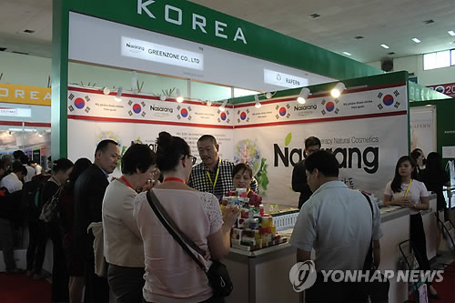 | △ 하노이 엑스포에 한국 중소기업들 참가 (하노이=연합뉴스) 김문성 특파원 = 15일 베트남 수도 하노이에서 나흘간의 일정으로 개막한 현지 최대 종합전시회 '하노이 엑스포 2015'에 81개의 한국 중소기업이 참가해 수주 상담에 나섰다. 코트라 하노이무역관은 "연내 한·베트남 자유무역협정(FTA) 발효를 앞두고 베트남 시장을 선점하는 효과를 내기를 기대한다"고 밝혔다. 2015.4.15 kms1234@yna.co.kr |