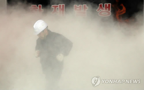 | △ 정부청사에 불이 난다면 (세종=연합뉴스) 배재만 기자 = '국가 안전대진단' 기간인 15일 오후 정부세종청사에서 열린 정부청사 위기상황 대처 점검훈련에서 한 직원이 소화기를 이용, 가상 화재를 진압하고 있다. |