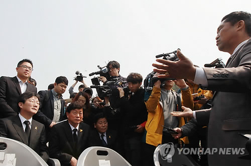 | △ 팽목항서 항의받는 유승민 새누리당 원내대표 (진도=연합뉴스) 장아름 기자 = 새누리당 유승민 원내대표가 15일 오후 세월호 참사 위령제 참석을 위해 진도 팽목항을 찾았으나 일부 참석자들의 항의를 받고 위령제에 불참하고 발길을 돌렸다. 이날 일부 참석자들이 유 의원을 향해 "새누리당은 여기 올 자격이 없다"며 돌아가라고 항의하고 있다. |