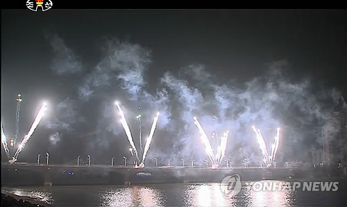 | △ 북한, 김일성 생일 '태양절' 경축 불꽃놀이 (서울=연합뉴스) 북한이 김일성 주석의 생일인 '태양절'을 맞아 15일 오후 8시 평양 대동강의 반월도와 옥류교, 능라다리 인근에서 대규모 축포 발사(불꽃놀이) 행사를 벌였다. 행사는 조선중앙TV와 조선중앙방송, 평양방송으로 생중계됐다. 2015.4.15 nkphoto@yna.co.kr |