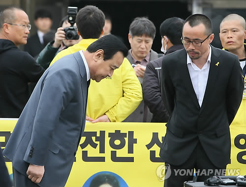| △ 합동분향소 참배 거부당한 이 총리 (안산=연합뉴스) 진성철 기자 = 이완구 국무총리가 16일 경기 안산시 단원구 세월호사고희생자정부합동분향소에서 전명선 가족대책위원장 등 유가족의 항의로 참배를 거부당하자 인사한 뒤 돌아서고 있다. |