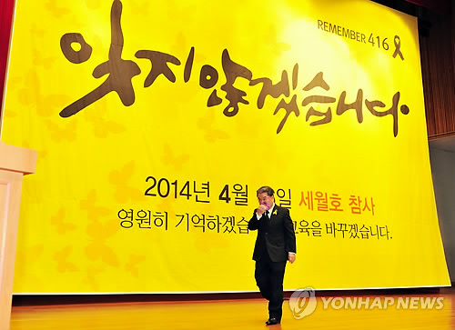 | △ "잊지 않겠습니다" 경기교육청 세월호 1주년 추모식 (수원=연합뉴스) 16일 오전 경기도 수원 경기도교육청 남부청사 다산관에서 거행된 도교육청 주관 세월호 참사 희생자 1주기 추모식에서 이재정 교육감이 추도사를 마치고 눈물을 닦으며 단상을 내려오고 있다. 2015.4.16 <<경기도교육청 제공>> ktkim@yna.co.kr |