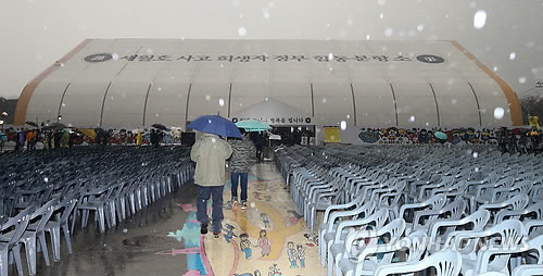 | △ 비 내리는 세월호 희생자 합동분향소 (안산=연합뉴스) 신영근 기자 = 세월호 참사 1주년인 16일 오후 경기도 안산시 단원구 세월호 희생자 정부 공식 합동분향소에 비가 내리고 있다. 2015.4.16 drops@yna.co.kr |