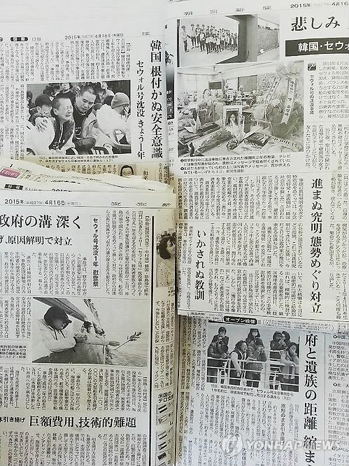| △ 세월호 1주기 조명한 일본 신문들 (도쿄=연합뉴스) 조준형 특파원 = 16일 세월호 참사 1주기를 맞아 사고 이후 한국 사회의 대응을 비판적으로 소개하는 데 상당한 지면을 할애한 아사히, 요미우리, 도쿄, 산케이 등 일본 주요 신문들. |