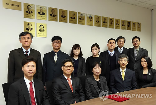 | △ 고려대, 고 단원고 전수영교사 기리는 장학금 기부식 (서울=연합뉴스) 16일 오후 서울 성북구 고려대에서 지난 해 세월호 참사 당시 제자들을 구하다 안타깝게 세상을 떠난 故전수영 교우를 기리는‘전수영 장학금’기부식이 열렸다. '전수영 장학금' 1천985만원은 올해로 입학 30주년을 맞은 고려대 85학번 동기회가 마련했다. 앞줄 왼쪽 세번째는 어머니 최숙란씨, 앞줄 왼쪽 네번째는 한용진 사범대학장, 그외 전수영 교우 친구들과 85학번 동기회원들. (고려대 제공) |