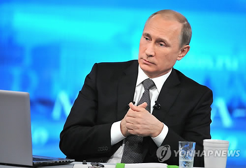 | △ (AP=연합뉴스) 블라디미르 푸틴 러시아 대통령이 16일 열린 '국민과의 대화'에서 시민들이 보낸 질문을 듣고 있다. 2015.4.16 |