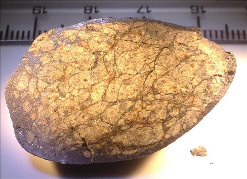 | △ 러시아 첼랴빈스크 운석. 충돌과 대기권 진입 당시 구성 성분이 녹으면서 만들어진 선들과 어두운 색깔 부분이 많이 보인다. 데이비스 캘리포니아대(UC 데이비스) 제공. |