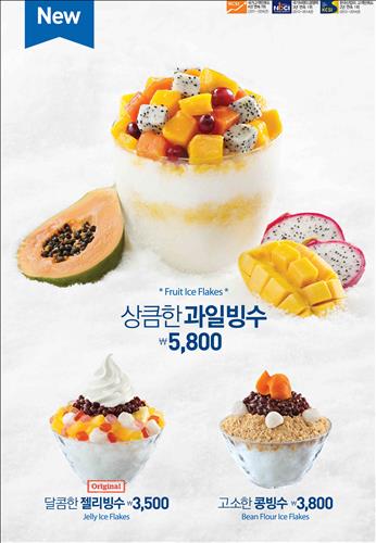 과일빙수(5천800원)는 다양한 열대과일에 망고 시럽을 넣어 상큼하고, 콩빙수(3천800원)는 콩가루와 곶감·찹쌀떡을 넣어 고소한 맛이 특징이다.