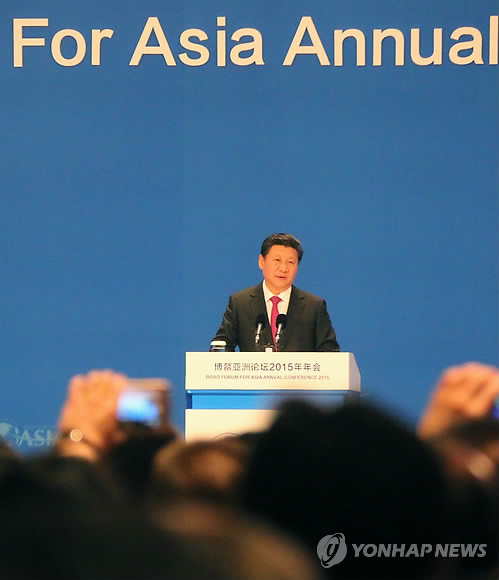 | △ 시진핑, '아시아 운명공동체' 중국 주도 천명 (보아오<중국 하이난>=연합뉴스) 홍제성 특파원 = 시진핑(習近平) 중국 국가주석은 28일 아시아의 운명 공동체의 구축을 위해 중국이 주도적인 역할을 할 것임을 천명했다. 시 주석은 이날 오전 '아시아판 다보스포럼'으로 불리는 보아오(博鰲) 포럼 2015년 연차총회 공식 개막식에서 기조연설을 통해 "아시아가 운명 공동체를 향해 나아감으로써 새로운 미래를 개척해 나가자"고 촉구했다. 2015. 3.28 jsa@yna.co.kr |
