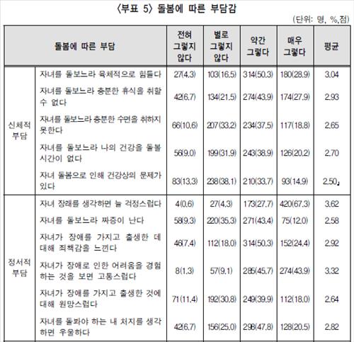그 외 평균점수가 3점을 넘는 항목을 보면 '자녀 돌봄으로 경제활동에 지장을 받는다'(3.05점), '자녀를 돌보느라 육체적으로 힘들다'(3.04점) 등이 있었다.
