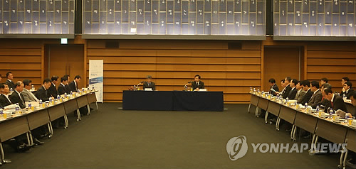 | △ 이네비게이션 포럼 창립식 (서울=연합뉴스) 임채두 기자 = 14일 서울 중구 대한상공회의소에서 열린 '이네비게이션(e-Navigation) 포럼 창립식'에서 의장으로 선출된 해양플랜트연구소 서상현 소장과 해양수산부 김영석 차관이 의사를 진행하고 있다. 2015.4.14 doo@yna.co.kr |